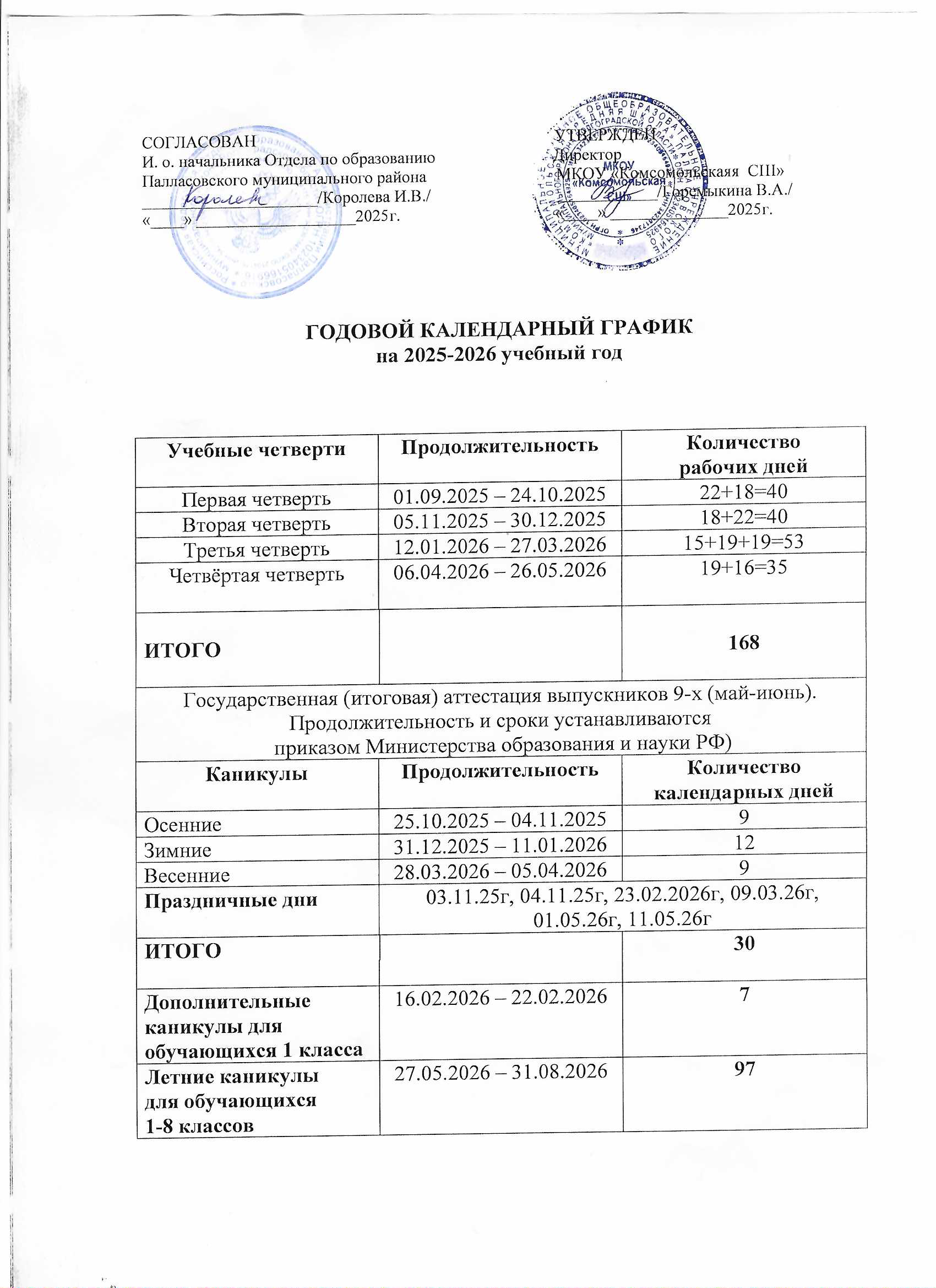 Продолжительность учебной недели для 1-11 классов 5 дней; продолжительность учебного года 34 учебные недели для 2-11, для 1 класса - 33 учебные недели; школа работает по четвертям (полугодиям).